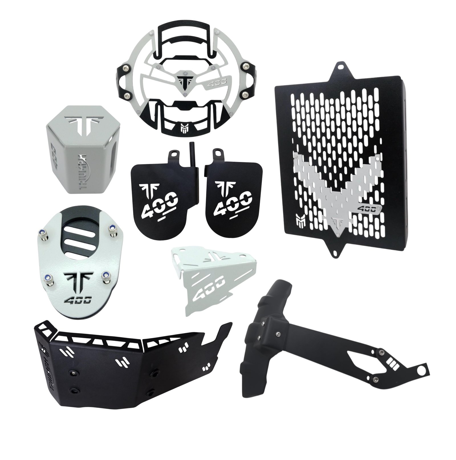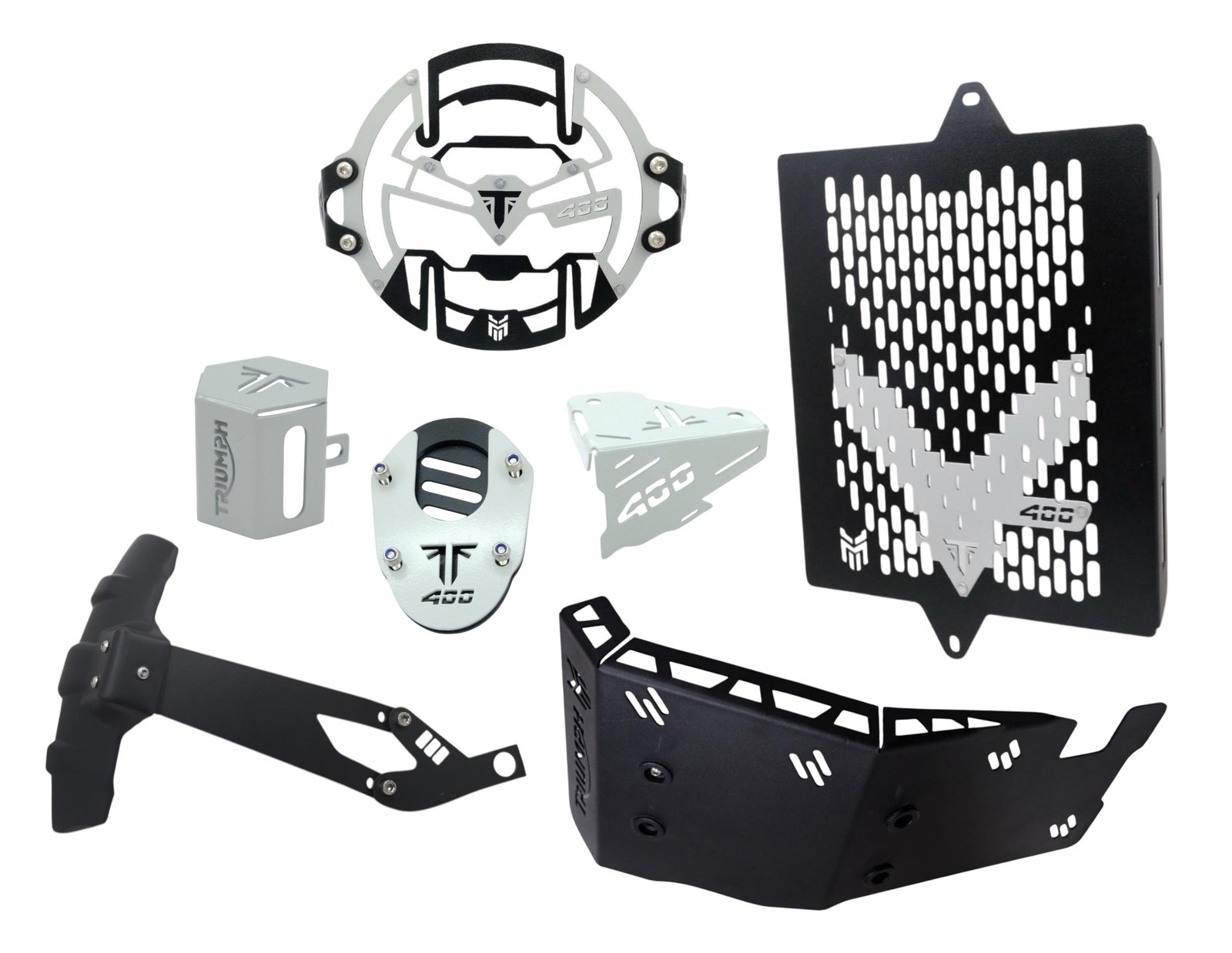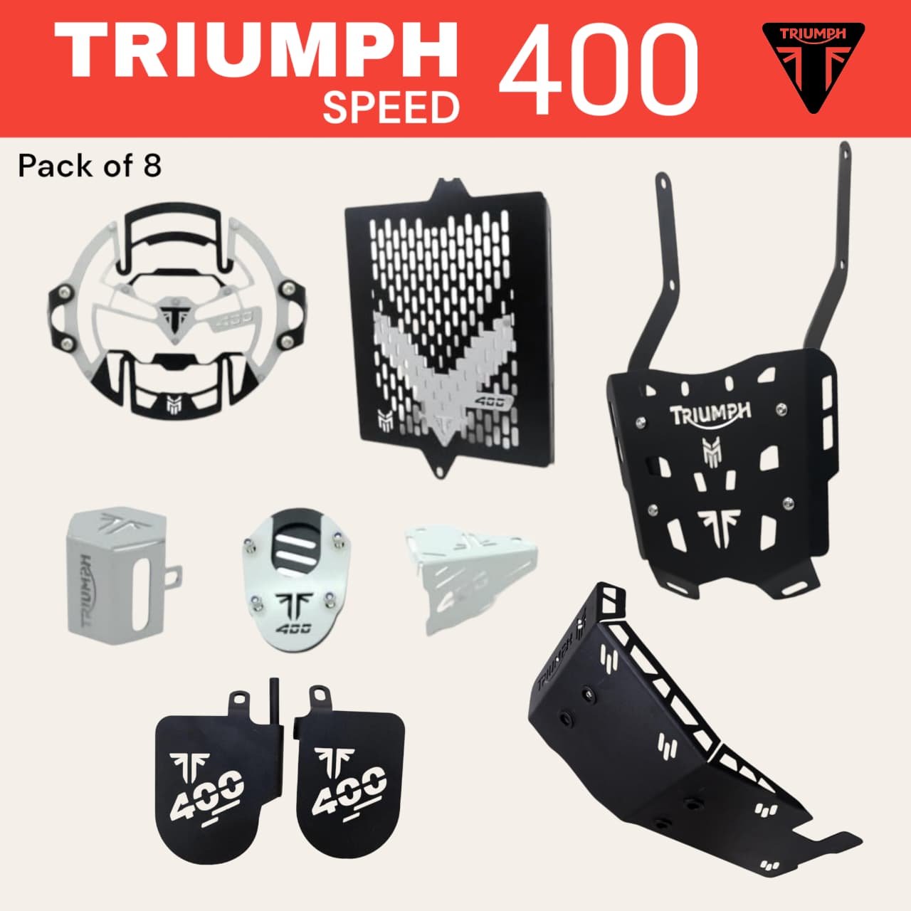 Motorcycle Protection Kit for Triumph Speed 400, 8-Piece Set, Black and Grey, Includes Radiator Guard, Headlight Grill, Sump Guard. ₹5366.00 ₹3499.00 Add to cart Buy Now