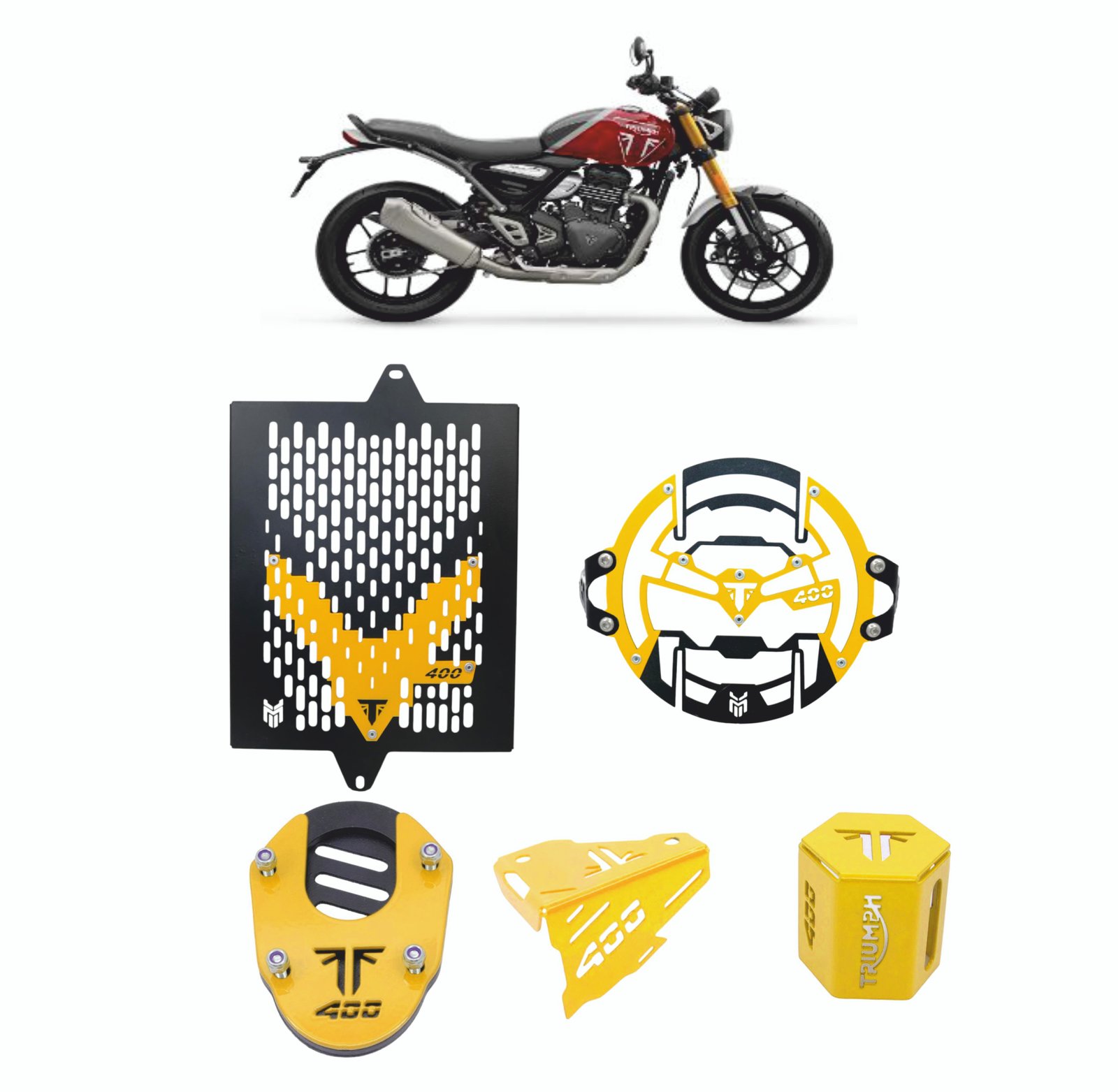 Triumph Speed 400 Motorcycle Accessory Combo Kit, 5 Piece Set with Headlight Grill, Radiator Guard, Side Stand Extender, Oil Caps, Yellow Accent Suitable For Triumph Speed 400. ₹2866.00 ₹1749.00 Add to cart Buy Now